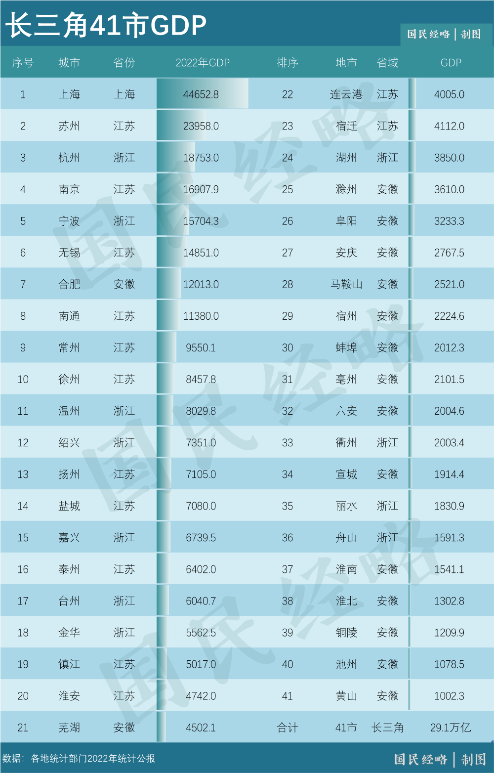 数据显示,2022年,长三角三省一市GDP合计约29.03万亿元,约占全国GDP总量的四分之一,全部地市都突破了千亿大关。