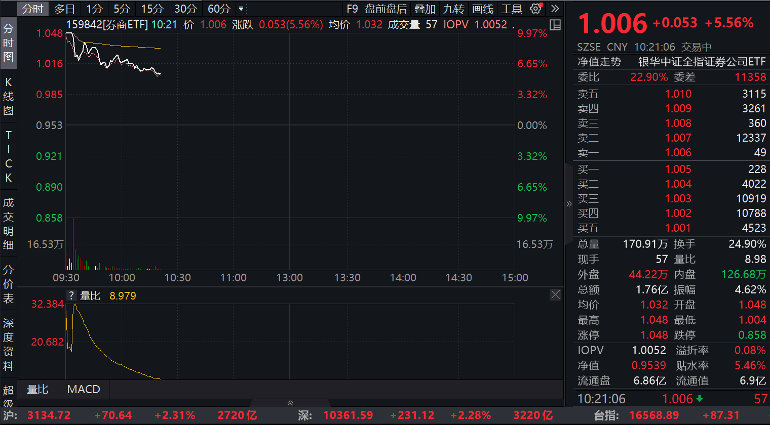 重大利好刺激下,截至10:21,券商ETF(159842)开盘涨停,现盘中震荡,已涨5.56%,成交额已达1.76亿,成交额持续扩大,换手率达24.90%,市场交投活跃。