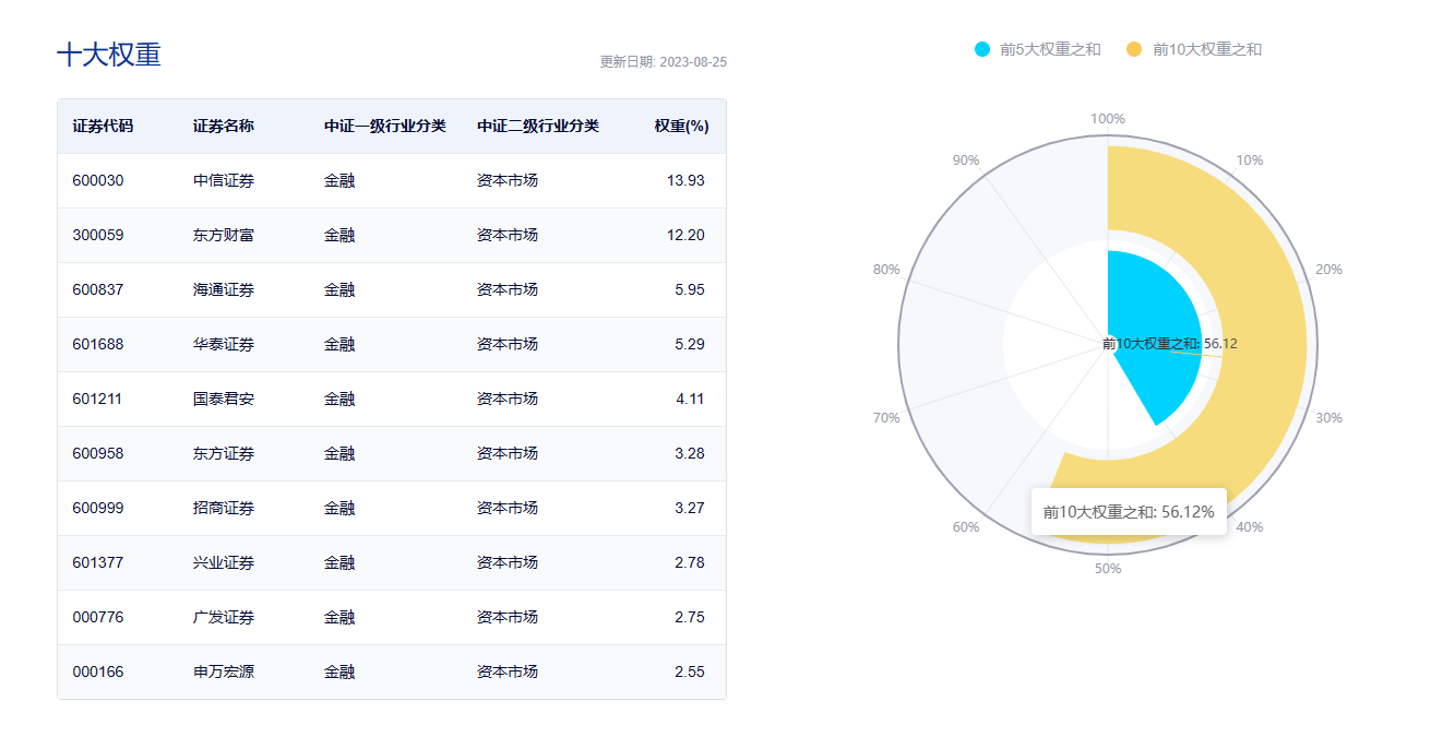数据显示,截至2023年8月25日,该指数前十大权重股包括中信证券、东方财富、海通证券、华泰证券、国泰君安等,前十大之和为56.12%。(数据来源:中证指数公司,指数成份股不代表个股推荐)