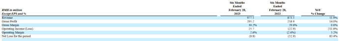 近日,博实乐发布截至2023年2月28日的2023财年半年报,期内收入9.78亿元,同比增长11.9%,净亏损880万元,同比收窄83.4%。