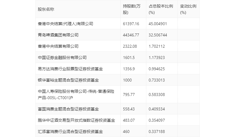 半年报显示,2023年上半年末的公司十大流通股东中,新进股东为鹏华中证酒交易型开放式指数证券投资基金、汇添富消费行业混合型证券投资基金,取代了一季度末的东方红启恒三年持有期混合型证券投资基金、富国价值创造混合型证券投资基金。在具体持股比例上,香港中央结算(代理人)有限公司、中国人寿保险股份有限公司-传统-普通保险产品-005L-CT001沪持股有所上升,香港中央结算有限公司、银华富裕主题混合型证券投资基金、富国消费主题混合型证券投资基金持股有所下降。