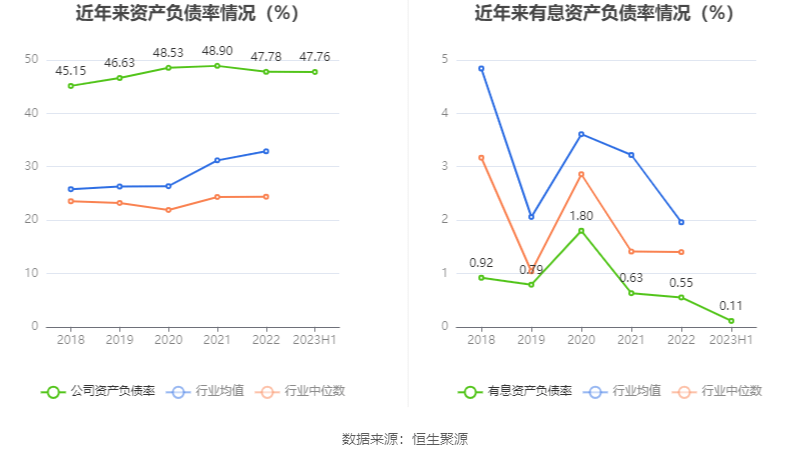 偿债能力方面,公司2023年二季度末资产负债率为47.76%,相比上年末减少0.02个百分点;有息资产负债率为0.11%,相比上年末减少0.44个百分点。