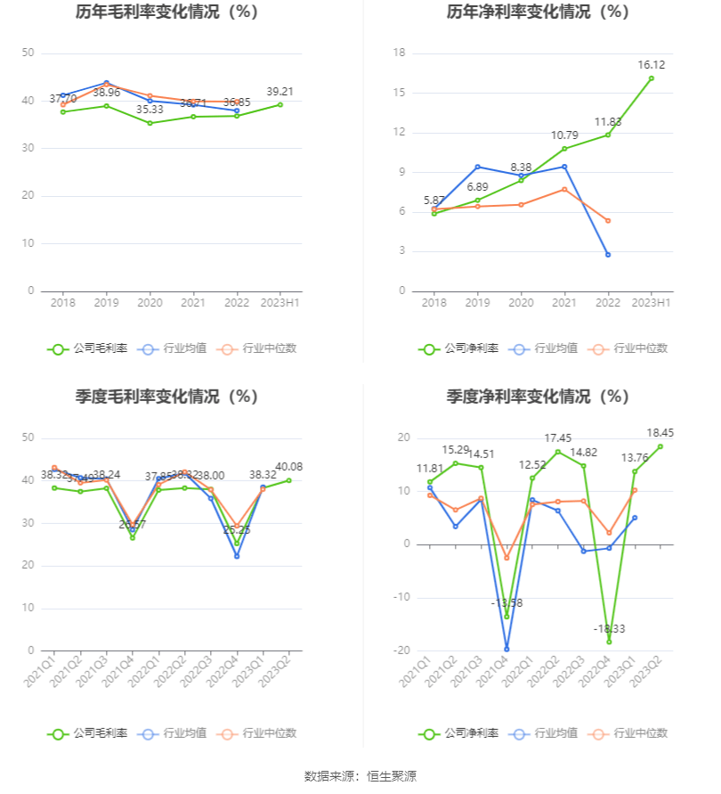 2023年上半年,公司毛利率为39.21%,同比上升1.11个百分点;净利率为16.12%,较上年同期上升1.03个百分点。从单季度指标来看,2023年第二季度公司毛利率为40.08%,同比上升1.76个百分点,环比上升1.76个百分点;净利率为18.45%,较上年同期上升1.00个百分点,较上一季度上升4.69个百分点。