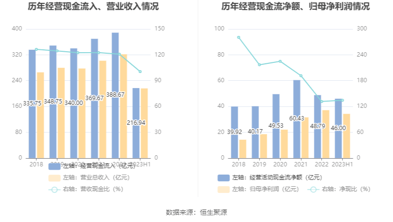 2023年上半年,公司营业收入现金比为100.47%,净现比为134.30%。