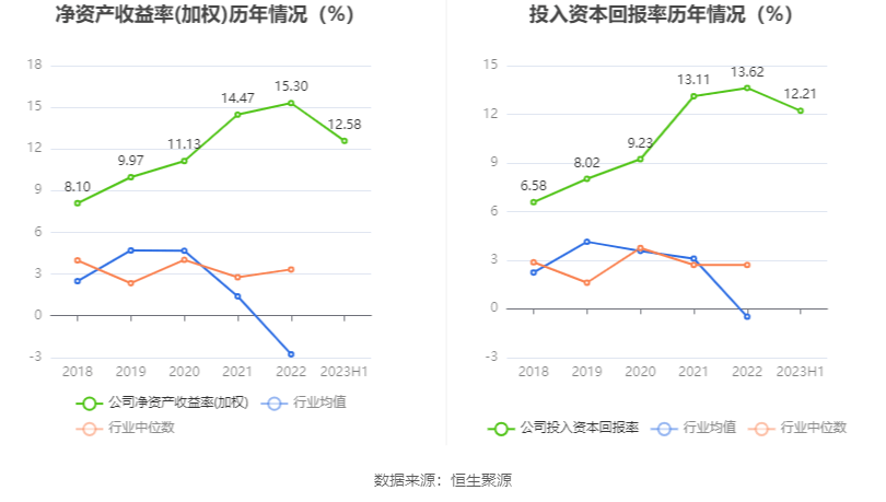 数据显示,2023年上半年公司加权平均净资产收益率为12.58%,较上年同期增长0.93个百分点;公司2023年上半年投入资本回报率为12.21%,较上年同期增长1.16个百分点。