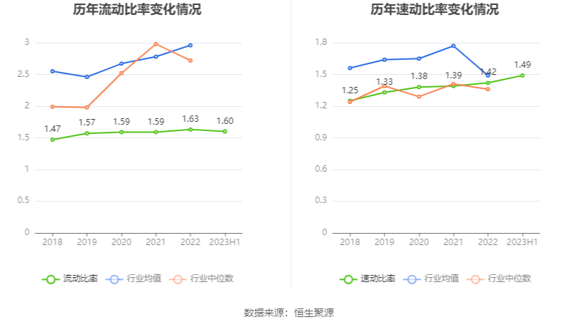 2023年上半年,公司流动比率为1.60,速动比率为1.49。