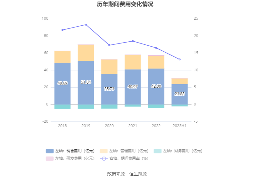2023年上半年,公司期间费用为28.42亿元,较上年同期增加1.78亿元;但期间费用率为13.16%,较上年同期下降0.66个百分点。其中,销售费用同比增长12.31%,管理费用同比下降7.27%,研发费用同比增长30.34%,财务费用由去年同期的-1.85亿元变为-2.23亿元。