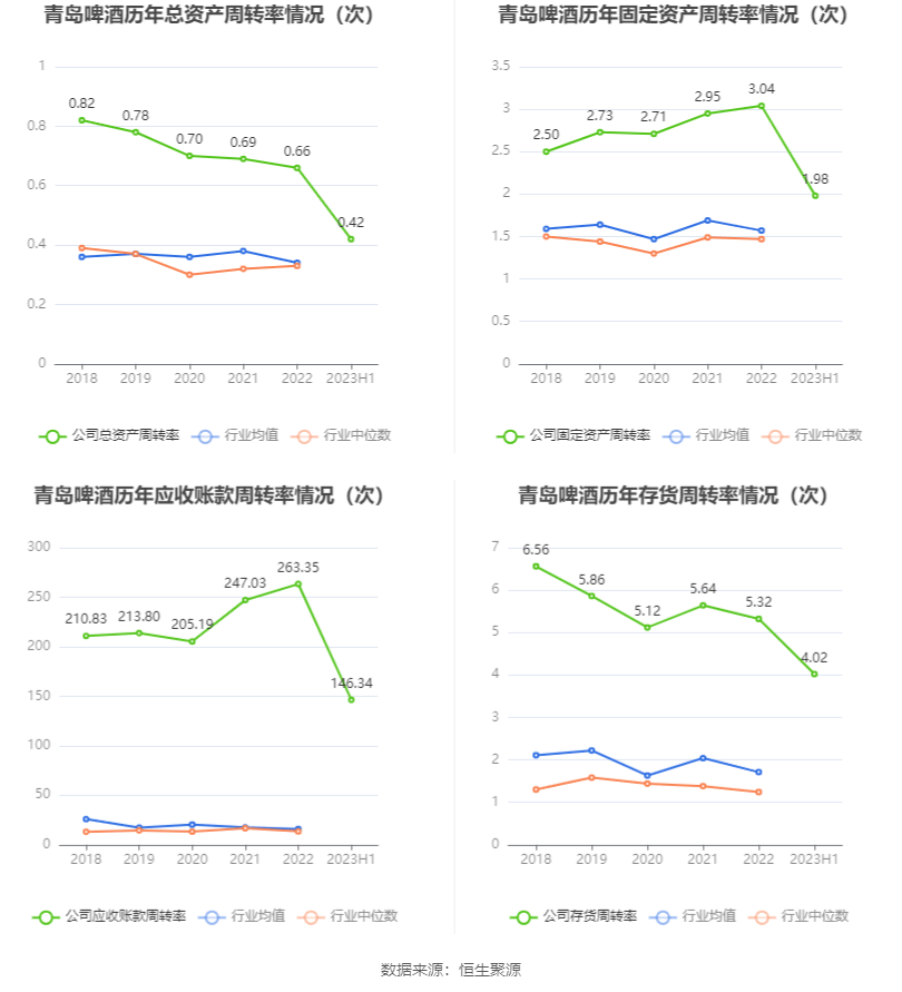 营运能力方面,2023年上半年,公司总资产周转率为0.42次,上年同期为0.40次(2022年上半年行业平均值为0.16次,公司位居同行业2/16);固定资产周转率为1.98次,上年同期为1.84次(2022年上半年行业平均值为0.76次,公司位居同行业3/16);公司应收账款周转率、存货周转率分别为146.34次、4.02次。
