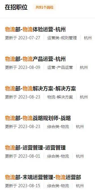 目前在淘天集团招聘官网上,已经上线了四十多个物流部相关岗位,涵盖运营管理、战略规划、成本管理、末端运营、服务商管理、仓储管理等多个方向。