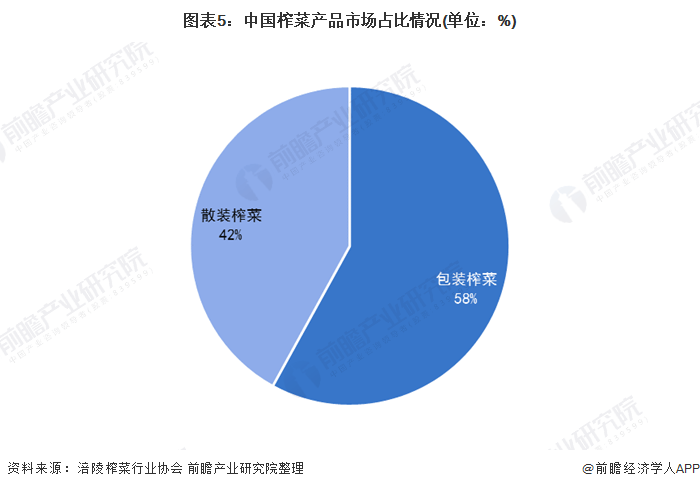 近年来,我国榨菜的消费场景增多,从过去的以旅途消费为主,逐渐转变为以居家、办公等消费场景为主,我国榨菜的销量也随之增加。从产品包装上来看,我国包装榨菜约占我国榨菜产品市场的58%,散装榨菜约占42%,前瞻分析认为,随着消费者食品安全诉求的提升,我国榨菜产品中包装榨菜的销售比例还将进一步扩大。
