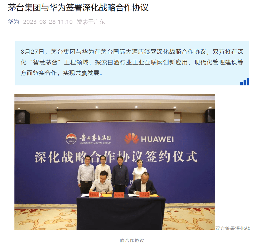 IT之家查询获悉,早在 2020 年,茅台与华为就签订了战略合作协议,共同推动茅台的数字化转型。此次深化战略合作协议的签署,预示着双方将继续拓展合作领域,提高合作层次,加速推进茅台集团数字化转型。