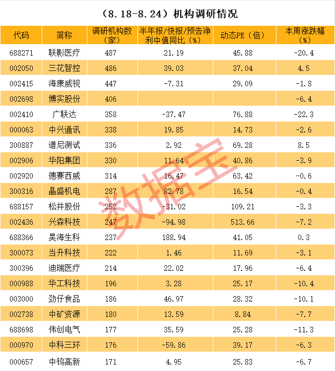 三花智控、海康威视、博实股份、广联达等个股获得百家以上机构评级。三花智控获得486家机构调研,该股拥有时下众多热门科技题材,包括特斯拉、储能、机器人等。公司上半年实现营业收入125.29亿元,同比上升23.32%;实现营业利润16.79亿元,同比上升35.57%;归属于上市公司股东的净利润13.95亿元,同比上升39.03%。