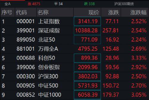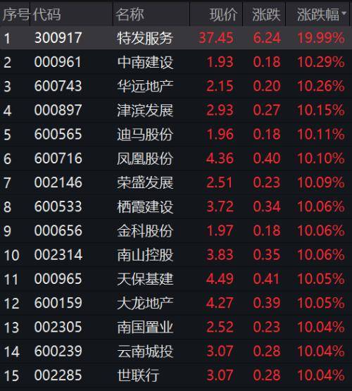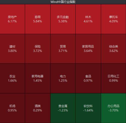 盘面上,各板块普涨,房地产、券商冲在最前方。办公用品、贵金属、白酒走低,食盐概念回落。