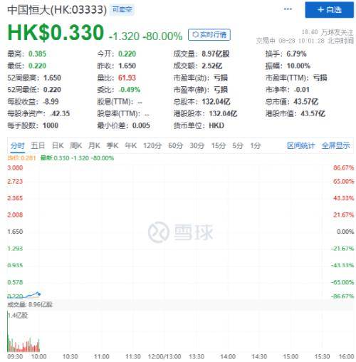 8月28日上午,中国恒大正式复牌。复牌后无悬念大跌:早间低开0.22港元,跌幅达到87%。截至发稿股价略有回升,但跌幅仍超80%,百亿市值灰飞烟灭。