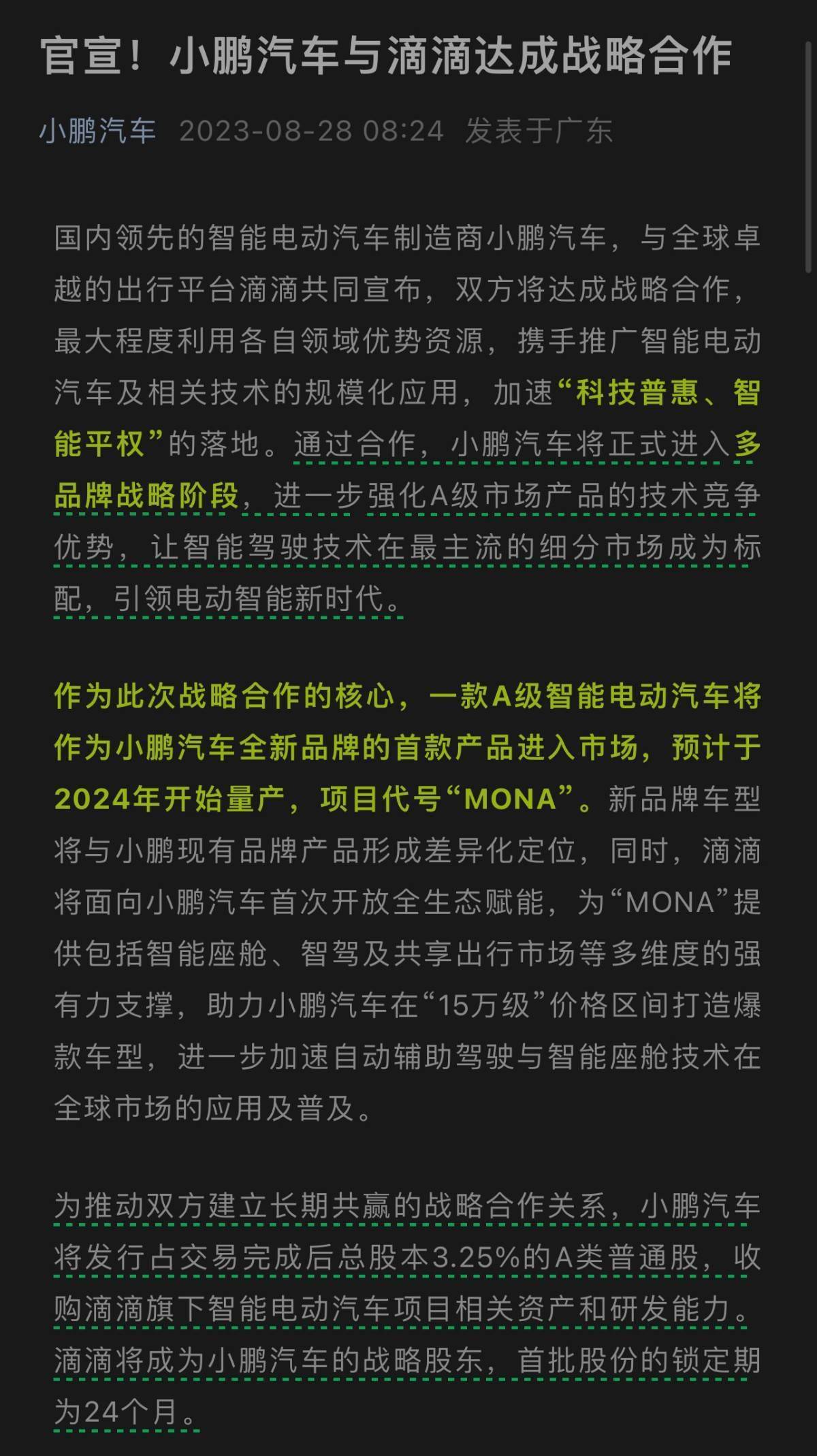 值得一提的是,本次双方达成战略合作的核心是一款 A 级智能电动车,小鹏内部代号 MONA,将作为小鹏全新品牌的首款产品进入市场,预计 2024 年投入量产。