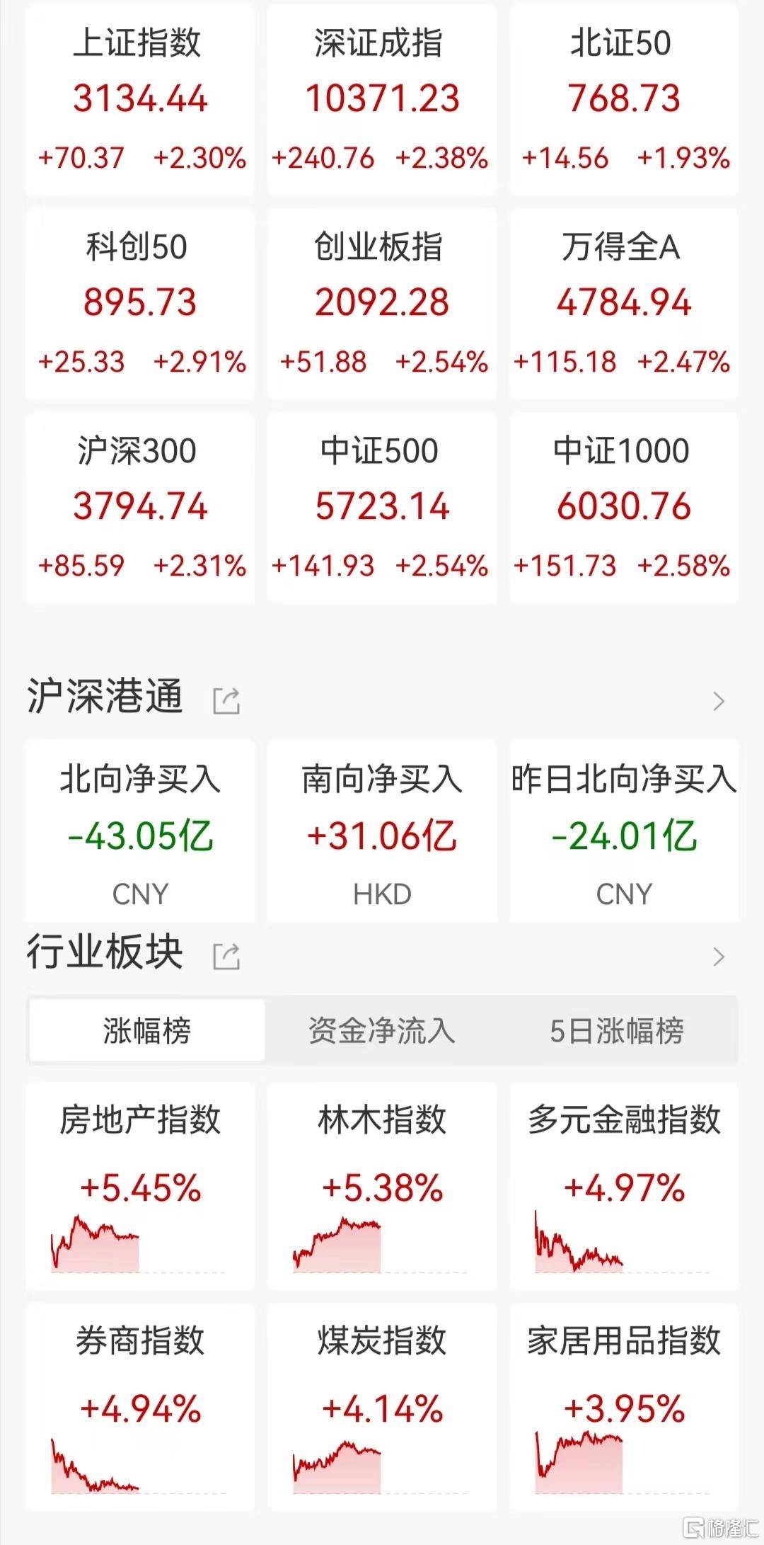 盘面上,房企再融资不受破发、破净和亏损限制,房地产板块强势拉升,特发服务20CM涨停,荣盛发展等多股涨停;印花税减半叠加收紧IPO等多项新政超预期推出,证券板块掀涨停潮,国盛金控等多股涨停;核污染防治板块持续走强,中电环保涨超15%;新一代人造太阳取得重大科研进展,可控核聚变板块走高,国光电气大涨13%;工程咨询服务板块拉升,招标股份20CM涨停;新型城镇化、煤炭、装修装饰及水泥建材等板块涨幅居前。另外,酿酒板块涨幅靠后,五粮液跌超2%拖累板块;贵金属板块逆势走弱,西部黄金跌超4%。