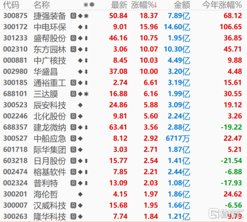 捷强装备涨超18%,中电环保涨近16%,华盛昌、中广核技等多股涨停。