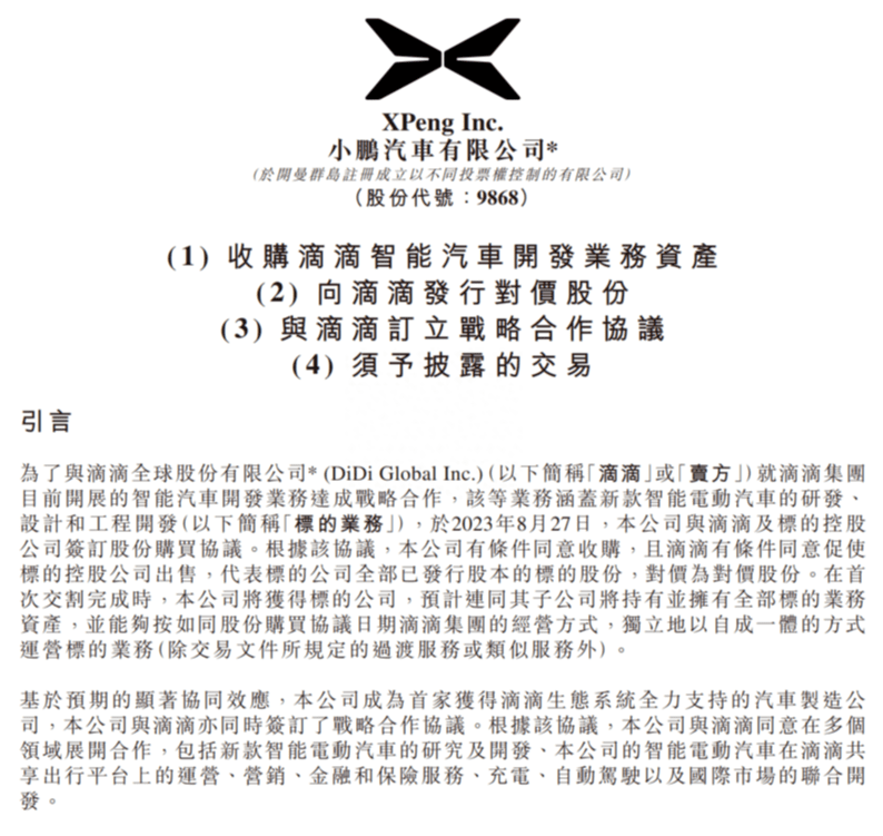 小鹏汽车在公告中表示,为推动双方建立长期共赢的战略合作关系,小鹏汽车将发行占交易完成后总股本3.25%的A类普通股,最高对价58.35亿港元,收购滴滴旗下智能电动汽车项目相关资产和研发能力。滴滴将成为小鹏汽车的战略股东,首批股份的锁定期为24个月。