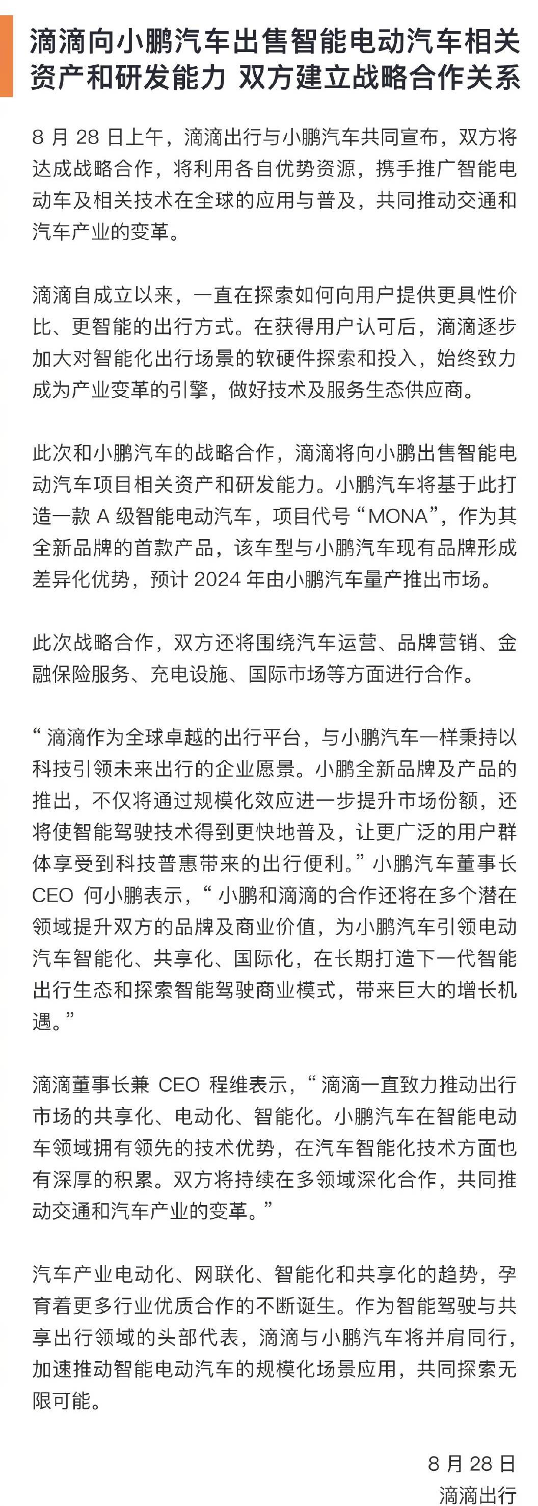 8月28日,滴滴出行与小鹏汽车共同宣布,双方将达成战略合作。滴滴将向小鹏出售智能电动汽车项目相关资产和研发能力。小鹏汽车将基于此打造一款A级智能电动汽车,项目代号“MONA”,预计2024年由小鹏汽车量产推出市场。