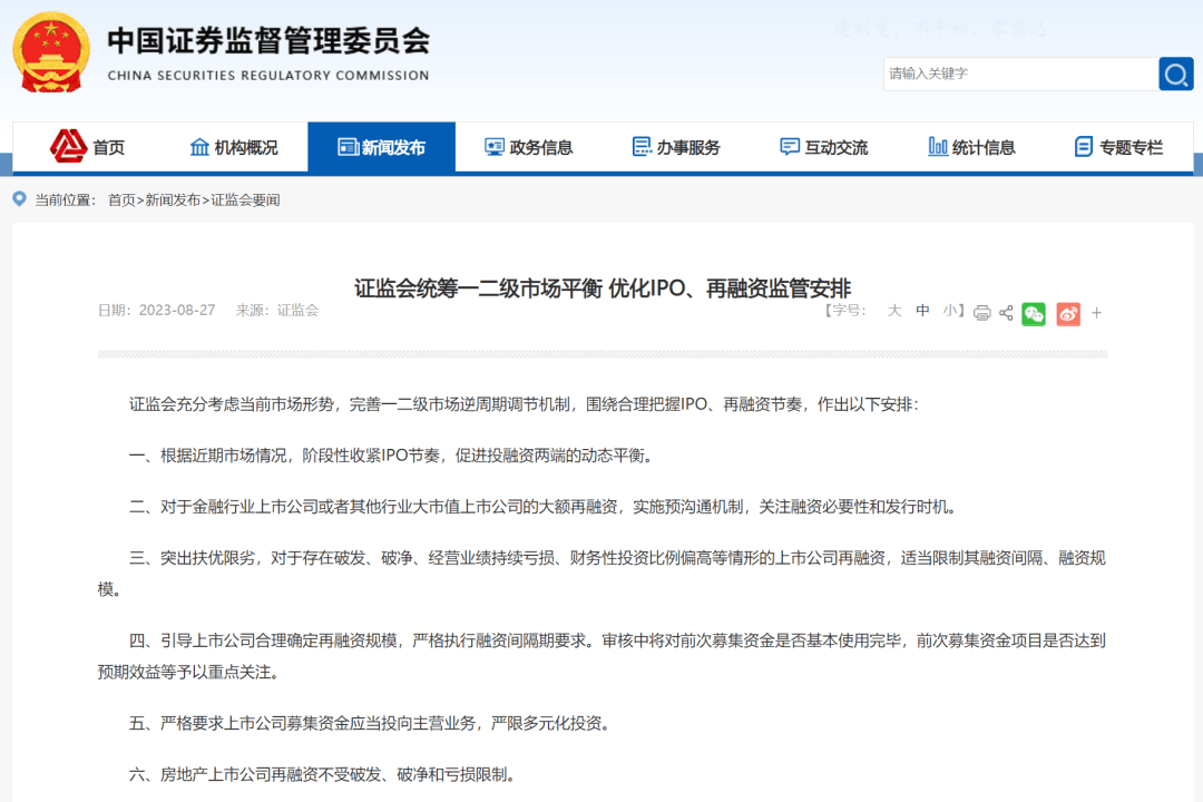 证监会统筹一二级市场平衡 优化IPO、再融资监管安排