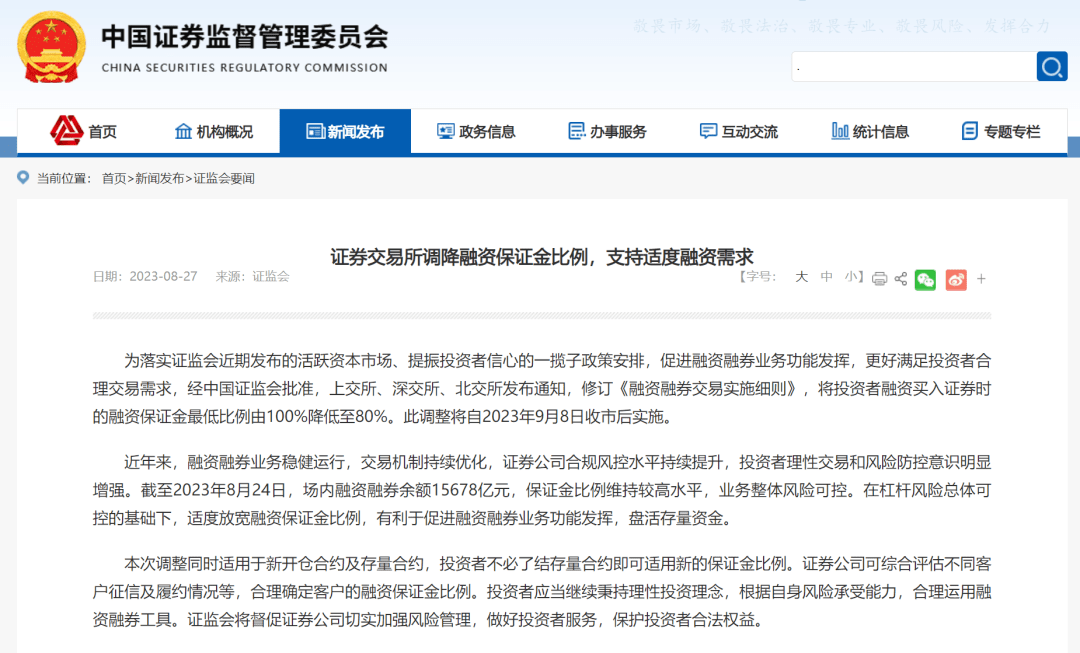 为落实证监会近期发布的活跃资本市场、提振投资者信心的一揽子政策安排,促进融资融券业务功能发挥,更好满足投资者合理交易需求,经中国证监会批准,上交所、深交所、北交所发布通知,修订《融资融券交易实施细则》,将投资者融资买入证券时的融资保证金最低比例由100%降低至80%。此调整将自2023年9月8日收市后实施。
