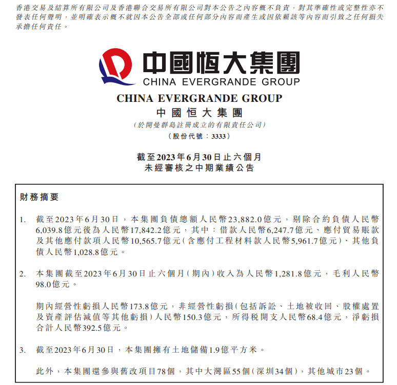 今年上半年,中国恒大经营性亏损173.8亿元,非经营性亏损(包括诉讼、土地被收回、股权处置及资产评估减值等)150.3亿元,所得税开支68.4亿元,净亏损合计392.5亿元。