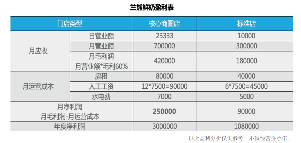 据蓝熊鲜奶给出的盈利参考表,一家位于核心商圈门店的月净利润可达25万元,标准店的月净利润可达9万元;核心商圈、标准店的年度净利润分别是300万元、108万元。