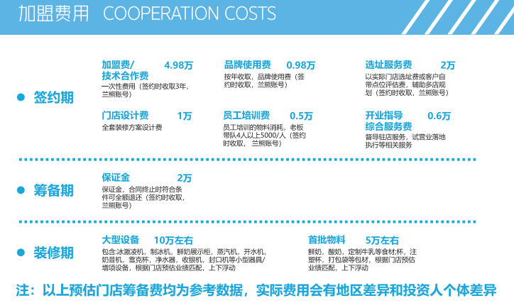 目前,蓝熊鲜奶已经开放北京、天津、西安、河北区域的加盟,加盟费用总价在30万元左右,其中包含加盟费4.98万元、门店设计费1万元、选址服务费用2万元、保证金2万元和10万元的设备费用等。