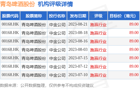 截至2023年8月25日收盘,青岛啤酒股份(00168.HK)报收于67.6港元,下跌1.39%,换手率0.26%,成交量170.56万股,成交额1.16亿港元。投行对该股的评级以跑赢行业为主,近90天内共有7家投行给出跑赢行业评级,近90天的目标均价为89港元。中金公司最新一份研报给予青岛啤酒股份跑赢行业评级,目标价89港元。