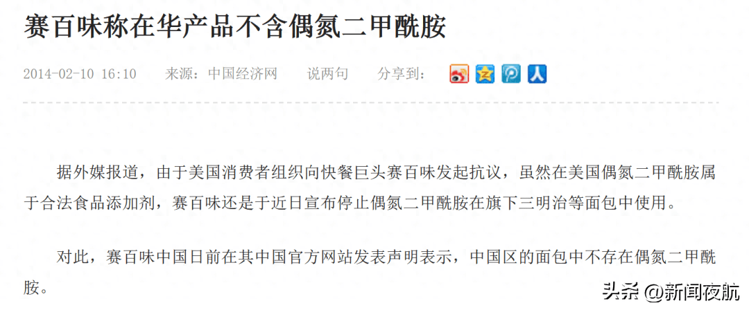 翻开历史报道可见,早在2014年,赛百味曾因面包含有偶氮二甲酰胺陷入了食品安全危机,该成分通常拿来作为橡胶鞋底和瑜伽垫的原料。对于事件,赛百味中国通过官方网站回应称,中国区的面包中不存在上述成分。