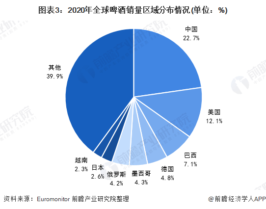 从全球啤酒消费分布来看,我国是啤酒消费大国。2020年,全球啤酒销量达18769.8万千升,其中中国啤酒销量为4269.4万千升,占全球啤酒销量的22.7%,为全球最大的啤酒消费国家。