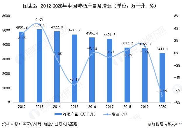 我国是啤酒生产大国和消费大国,我国啤酒制造已处于成熟期。中国啤酒行业进入新周期,产品结构不断优化,中高档需求增长。据国家统计局数据显示,2020年受疫情影响,我国啤酒产量完成3411.1万千升,同比下降7.0%。