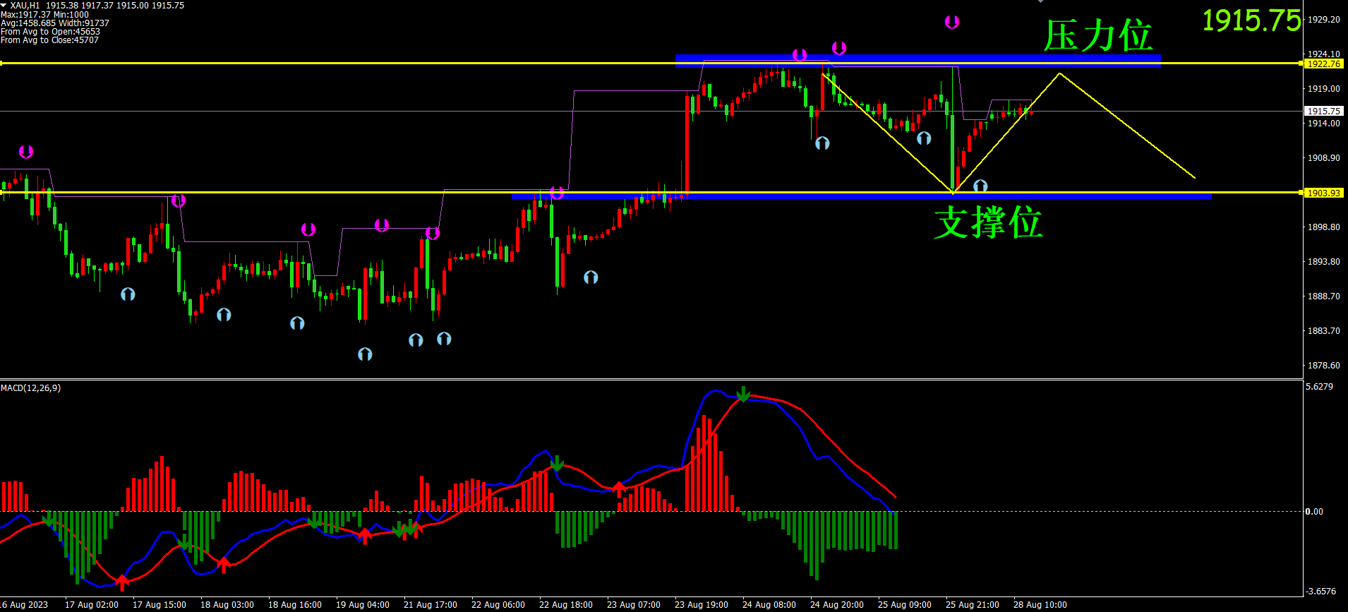 黄金技术指标avg显示目前K线在下轨附近运行,小时图周期为行情价格盘整,下方支撑1900.0附近(下轨),上方压力1920附近。MACD图形呈现均线相交箭头向上,目前盘整为主要MACD亚盘方向,能量柱显示波峰平缓且处于能量柱0轴上方且能量减弱。