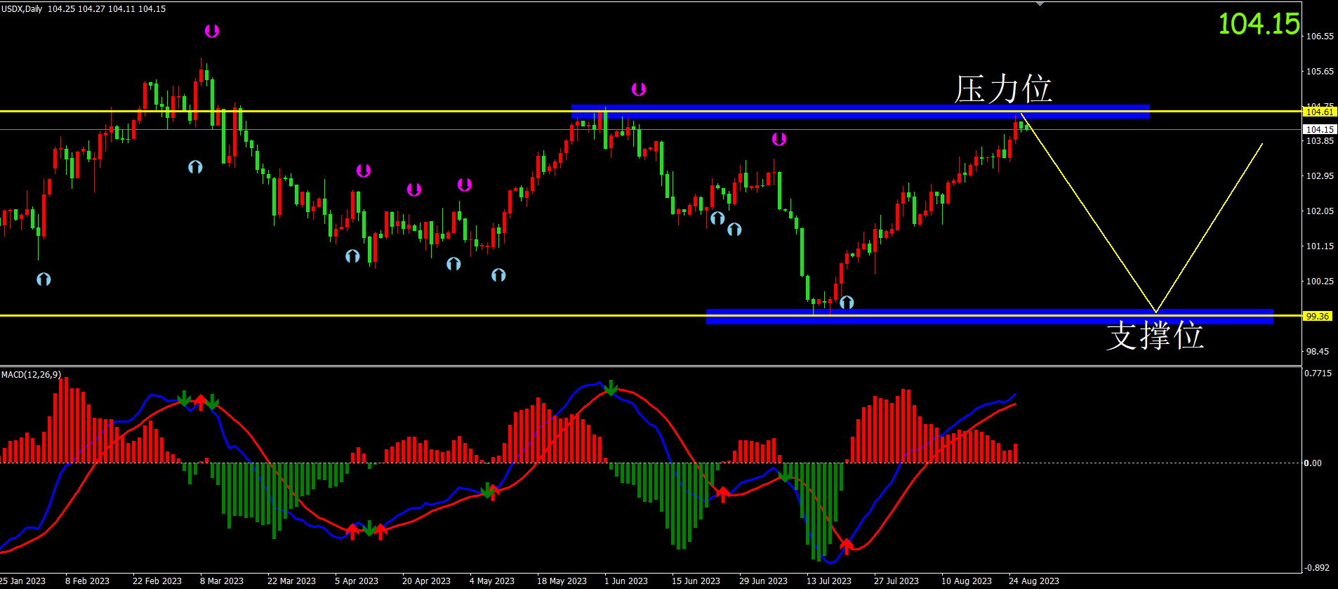 美元指数:图表显示目前美指为震荡反弹行情。关注压力105.00位置。