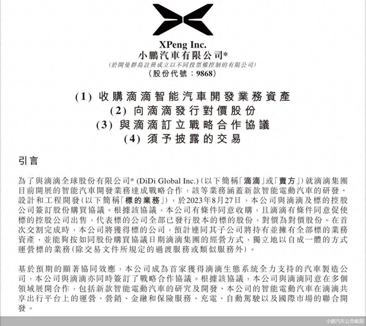 公告中提到,小鹏汽车成为首家获得滴滴生态体系全面支持的整车企业。双方将在多个领域探索互利共赢的长期合作机会,包括在滴滴平台上小鹏车型的运营、品牌营销、金融保险服务等,为期五年。