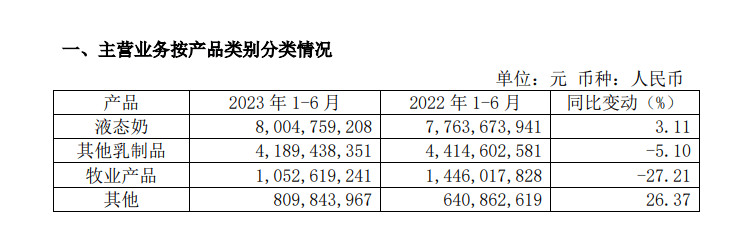 同期,牧业产品实现营收约为10.53亿元,同比减少27.21%;其他乳制品实现营收约41.89亿元,较上年同期下滑5.10%。