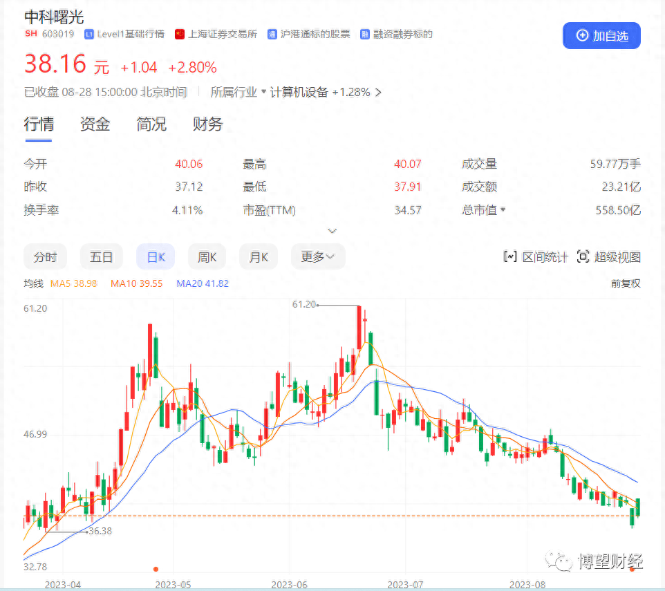 亮眼的业绩自然得到投资者的认可,反映在资本市场,中科曙光上半年股价高速飙升,由年初的不到23元增至最高价61.2元,不过,目前有所回调,截至8月28日收盘价38.16元,目前市值近600亿。