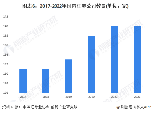 证券行业公司间产品差异较小,行业供给主要体现在证券公司数量以及营业部数量等方面。根据中国证券业协会数据显示,2022年国内证券公司数量共有140家,较2017年的131家多了9家,略有上升。总得来看,近五年我国证券行业供给总体保持稳定。