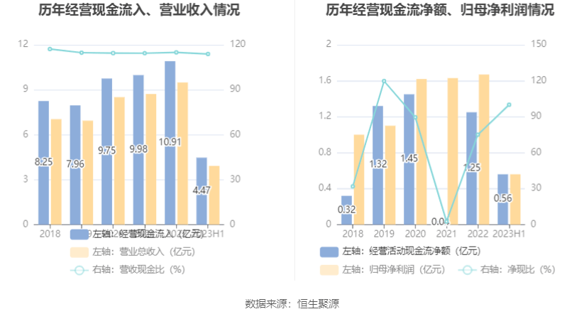 2023年上半年,公司营业收入现金比为113.90%,净现比为100.02%。