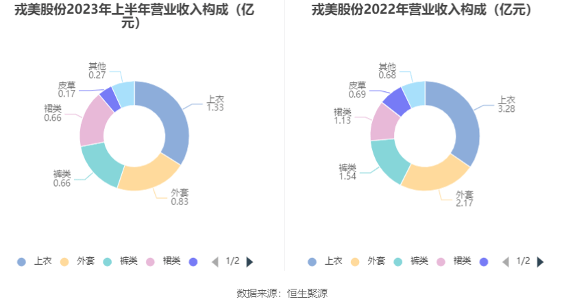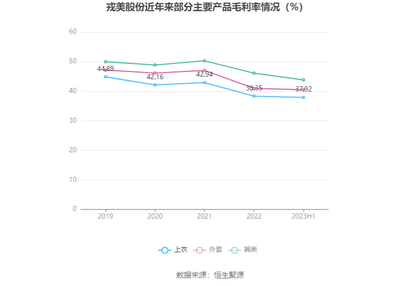 分产品看,上衣、外套、裤类2023年上半年毛利率分别为37.92%、40.53%、43.86%。