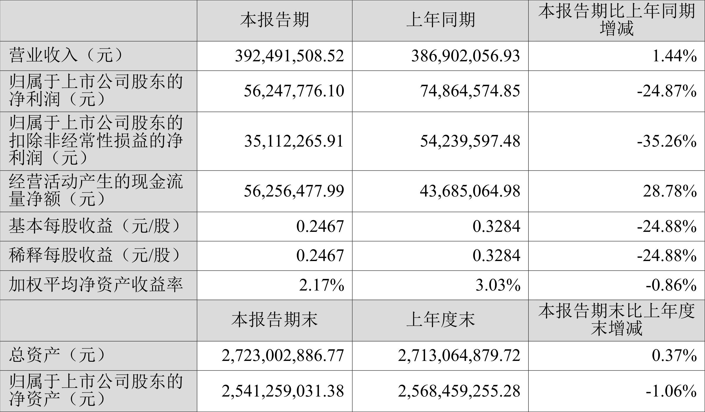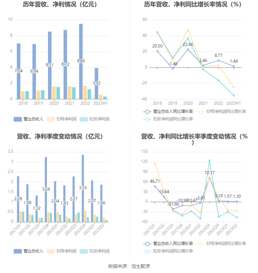 根据半年报,公司第二季度实现营业总收入1.86亿元,同比增长1.30%,环比下降10.30%;归母净利润1990.4万元,同比下降26.37%,环比下降45.23%;扣非净利润929.05万元,同比下降46.19%,环比下降64.02%。