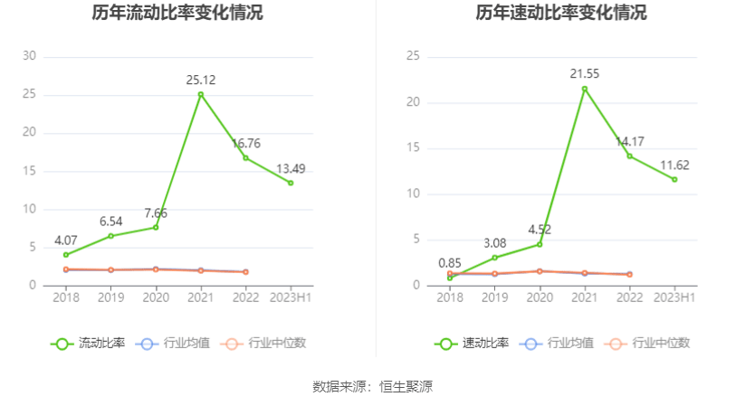 2023年上半年,公司流动比率为13.49,速动比率为11.62。