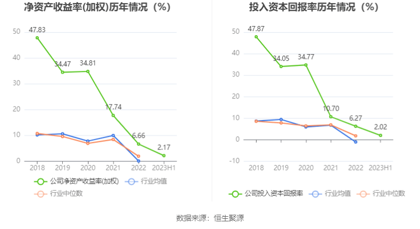 数据显示,2023年上半年公司加权平均净资产收益率为2.17%,较上年同期下降0.86个百分点;公司2023年上半年投入资本回报率为2.02%,较上年同期下降0.91个百分点。
