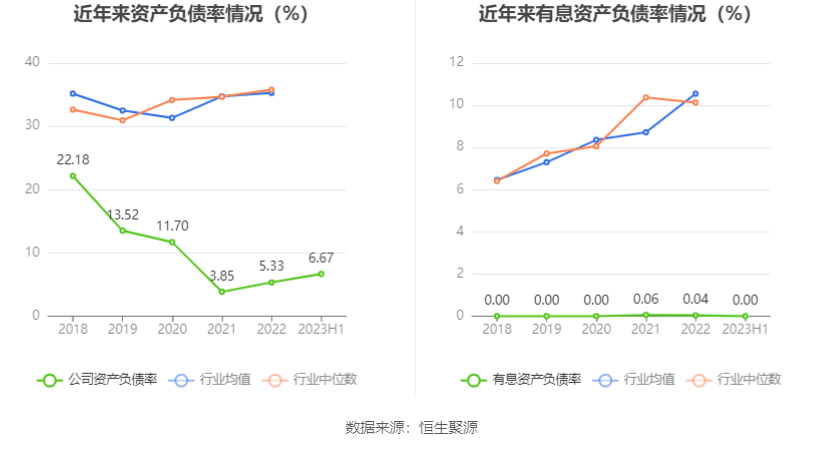 偿债能力方面,公司2023年二季度末资产负债率为6.67%,相比上年末增加1.34个百分点;有息资产负债率为0.00%,相比上年末减少0.04个百分点。