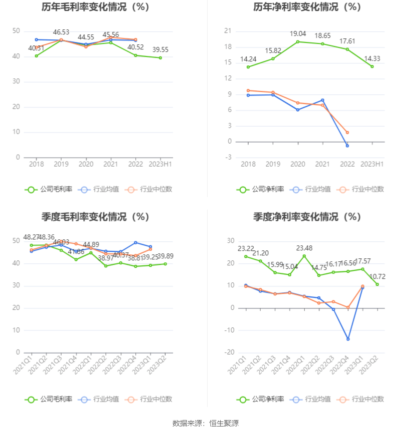 2023年上半年,公司毛利率为39.55%,同比下降2.54个百分点;净利率为14.33%,较上年同期下降5.02个百分点。从单季度指标来看,2023年第二季度公司毛利率为39.89%,同比上升0.92个百分点,环比上升0.64个百分点;净利率为10.72%,较上年同期下降4.03个百分点,较上一季度下降6.85个百分点。