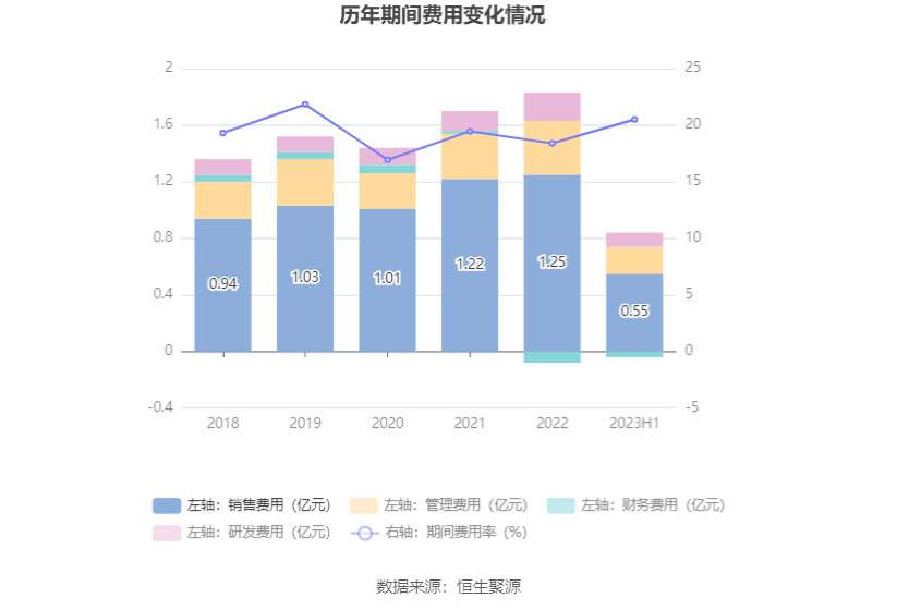 2023年上半年,公司期间费用为8050.23万元,较上年同期增加864.67万元;期间费用率为20.51%,较上年同期上升1.94个百分点。其中,销售费用同比增长9.57%,管理费用同比增长32.56%,研发费用同比增长14.66%,财务费用由去年同期的-185.08万元变为-406.29万元。