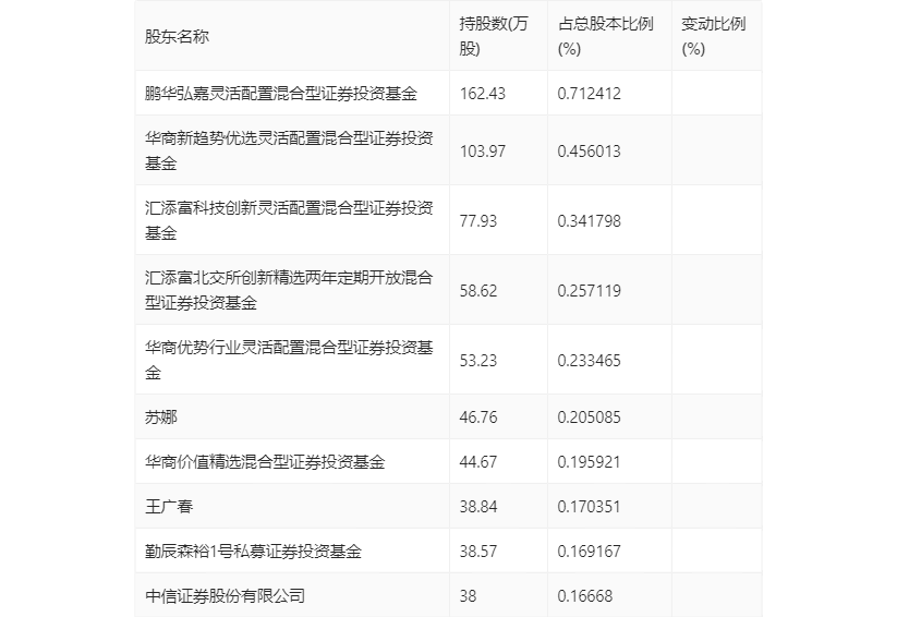半年报显示,2023年上半年末的公司十大流通股东中,新进股东为汇添富科技创新灵活配置混合型证券投资基金、汇添富北交所创新精选两年定期开放混合型证券投资基金、华商价值精选混合型证券投资基金、王广春、中信证券股份有限公司,取代了一季度末的勤辰金选森裕1号私募证券投资基金、尹睿彬、勤辰森裕2号私募证券投资基金、国源不争2号私募证券投资基金、国源不争1号私募证券投资基金。在具体持股比例上,华商新趋势优选灵活配置混合型证券投资基金、华商优势行业灵活配置混合型证券投资基金、苏娜持股有所上升,鹏华弘嘉灵活配置混合型证券投资基金、勤辰森裕1号私募证券投资基金持股有所下降。
