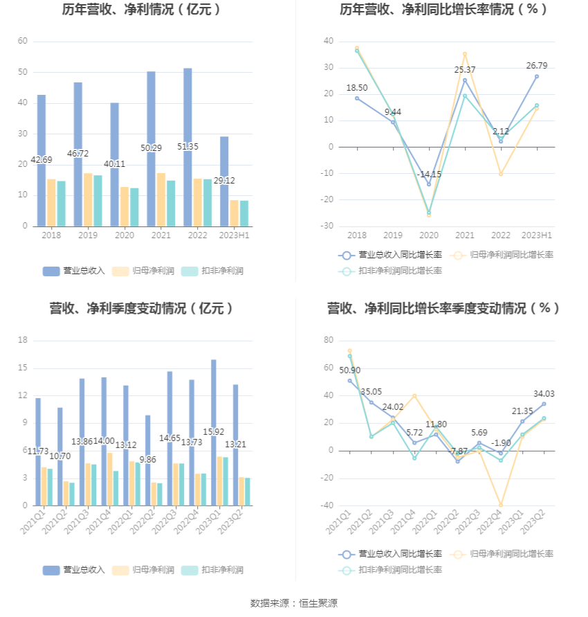 根据半年报,公司第二季度实现营业总收入13.21亿元,同比增长34.03%,环比下降17.01%;归母净利润3.12亿元,同比增长22.78%,环比下降41.74%;扣非净利润3.04亿元,同比增长23.67%,环比下降42.48%。