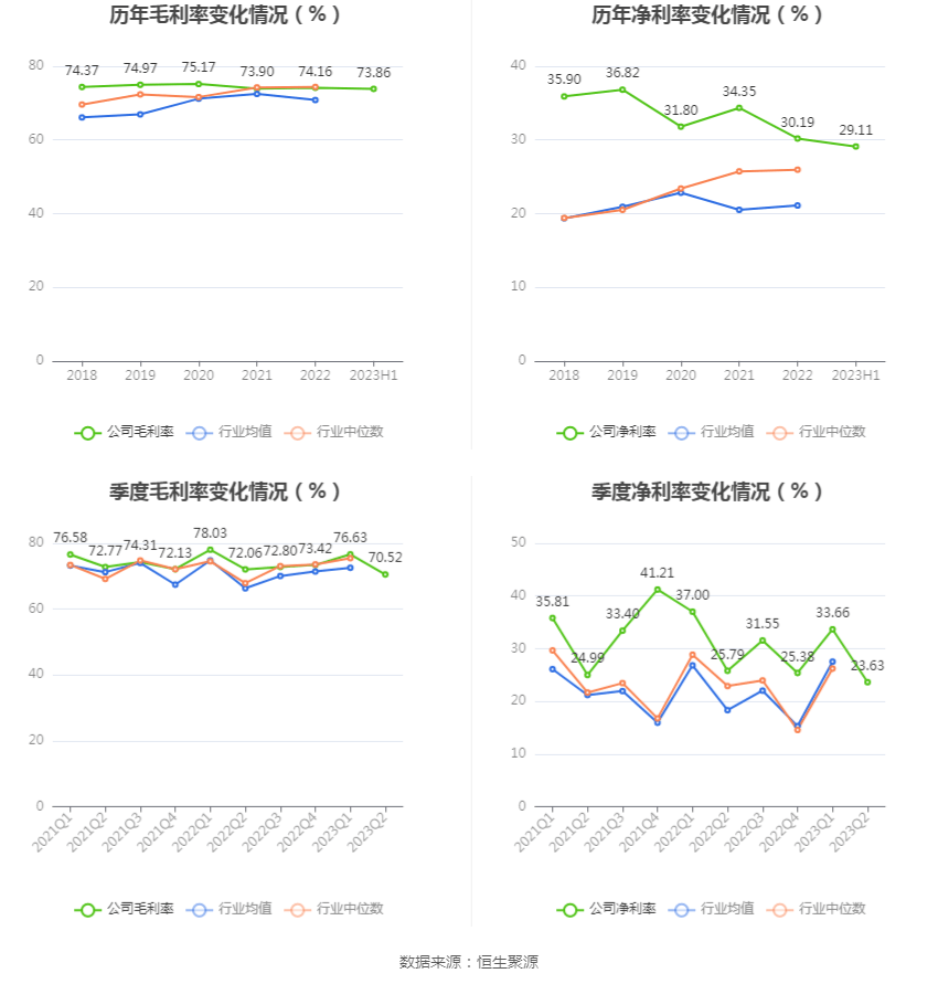 2023年上半年,公司毛利率为73.86%,同比下降1.61个百分点;净利率为29.11%,较上年同期下降3.08个百分点。从单季度指标来看,2023年第二季度公司毛利率为70.52%,同比下降1.54个百分点,环比下降6.11个百分点;净利率为23.63%,较上年同期下降2.16个百分点,较上一季度下降10.03个百分点。