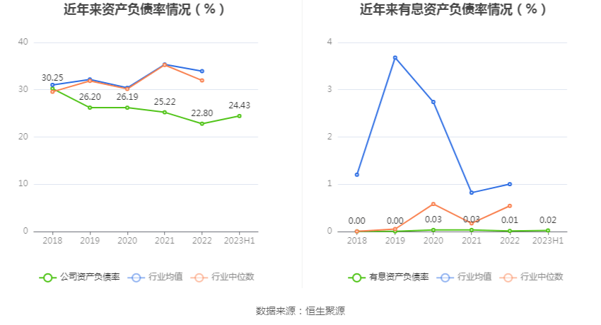 偿债能力方面,公司2023年二季度末资产负债率为24.43%,相比上年末增加1.63个百分点;有息资产负债率为0.02%,相比上年末增加0.01个百分点。